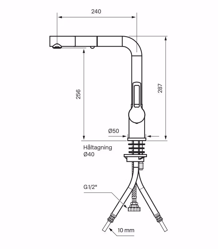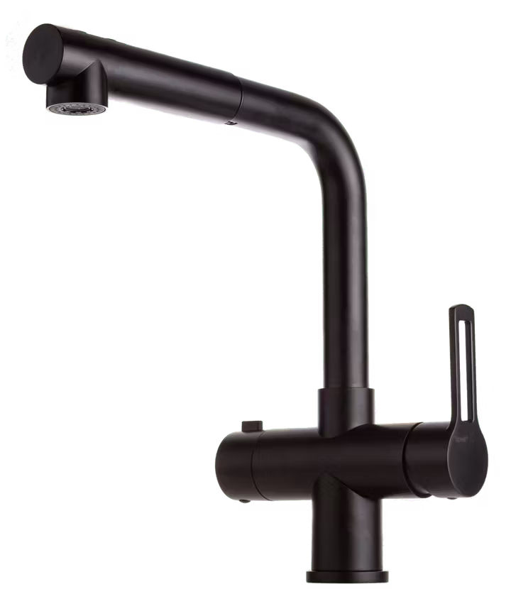 Köksblandare med bockad pip, diskmaskinsavstängning och utdragbar handdusch med sprayfunktion.