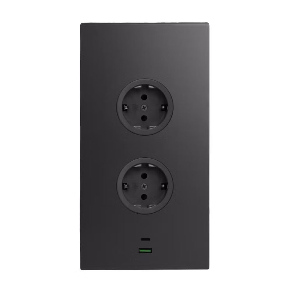 Hörnbox Asta är en modern vinklad eluttag i svart lackerat rostfritt stål med 2 jordade eluttag och 2 USB-A portar (1x USB-A och 1x USB-C) för stående eller liggande montering.