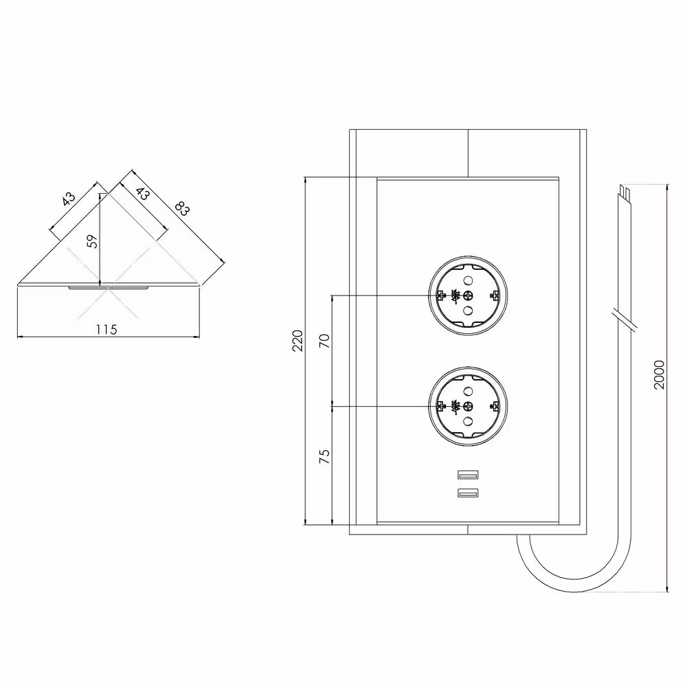 Hörnbox Asta är en modern vinklad eluttag i vit lackerat rostfritt stål med 2 jordade eluttag och 2 USB-A portar (1xUSBA och 1x USB-C), för stående eller liggande montering.