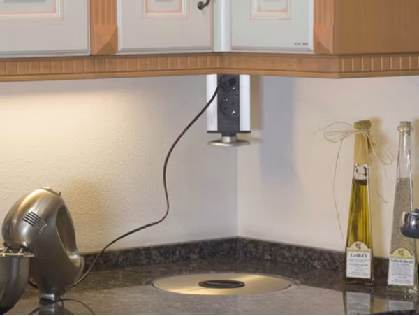 Med en lätt tryck på lockets backsidan kan du dra upp uttaget ur bänkskivan.