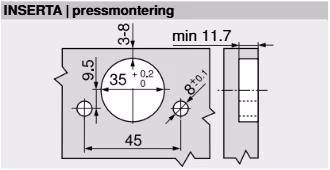 För att få gångjärnet att passa innanförliggande luckor använd denna gångjärn inklusive en 9mm tjockare monteringsplatta.