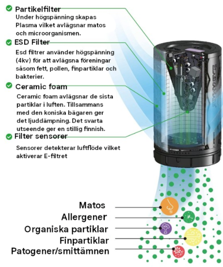 Ett PlasmaMade E-filter avlägsnar dofter och micro-organism med hjälp av sin patenterade elektrostatiska partikelfiltret. I combination med Plasma ser ESD-Filtret att föroreningar såsom findamm, matos, fett, pollen och bakterier bryts ner.