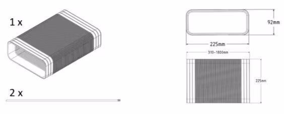 Robust, tjockväggig, rektangulär ventilationskanal i aluminium. Speciellt utformad för snabb och professionell anslutning av spishällar med integrerad fläkt. Ingen tidskrävande hantering av plastkanaler, böjar och kopplingar. Röret är robust men ändå mycket flexibel och lätt att böja i alla kurvor och vinklar. Kanalen kan dras ut upp till 1800 mm och levereras med 2 snabbkopplingar i rostfritt stål.